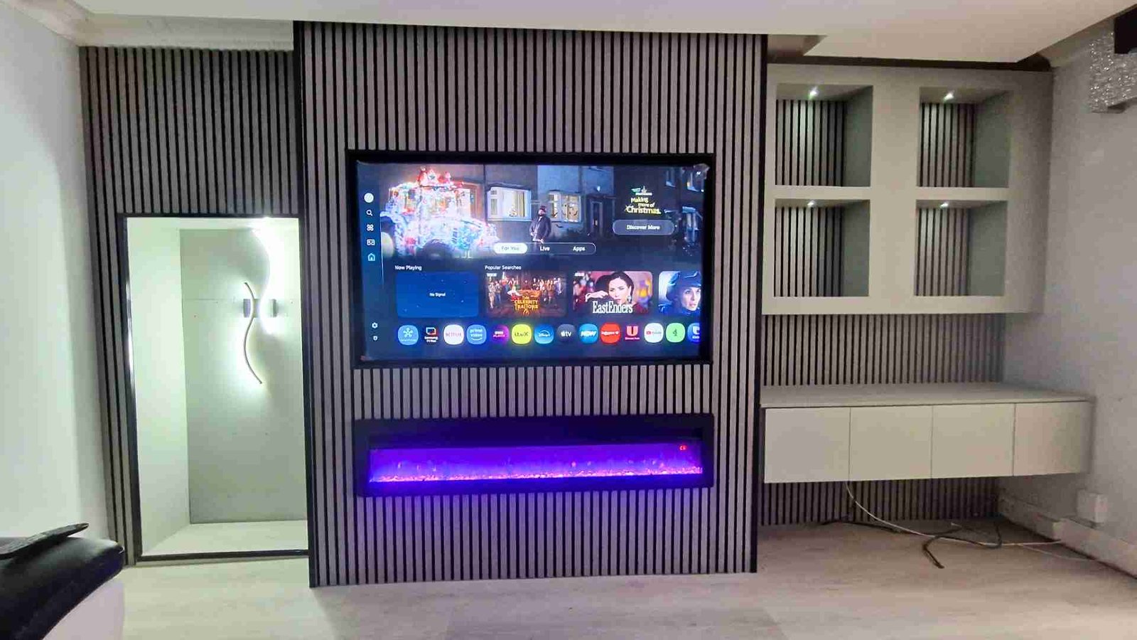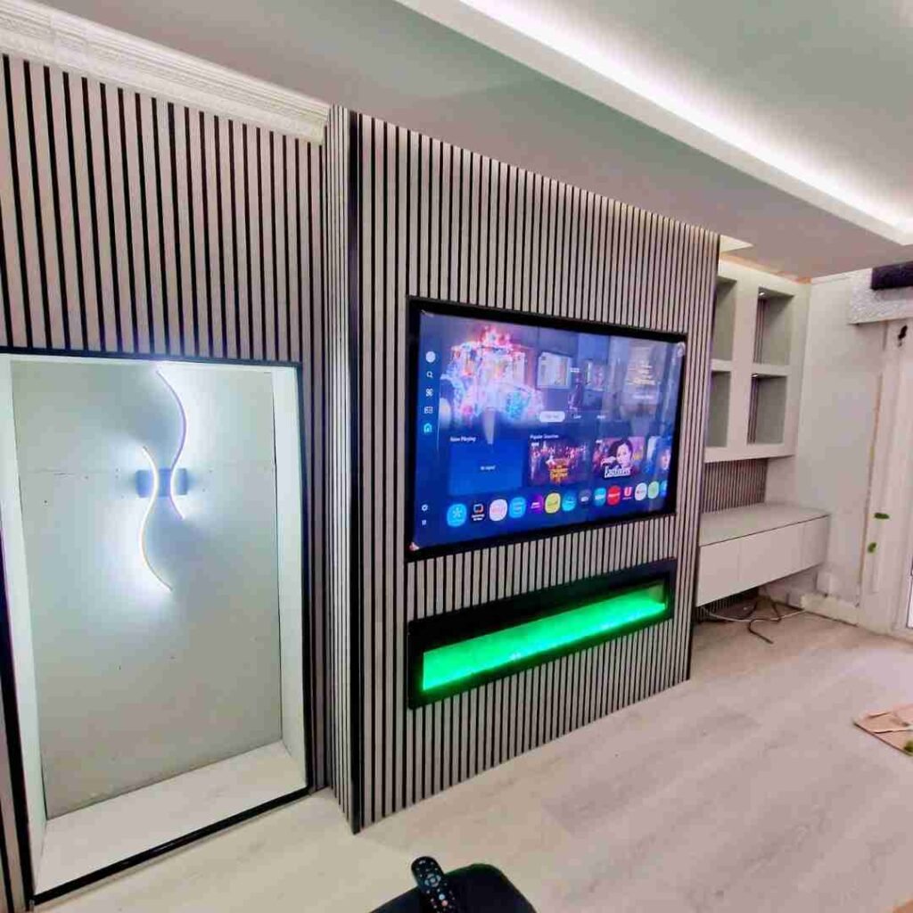 Bespoke media walls with lighting, shelving, and modern fireplaces designed to transform your living space.